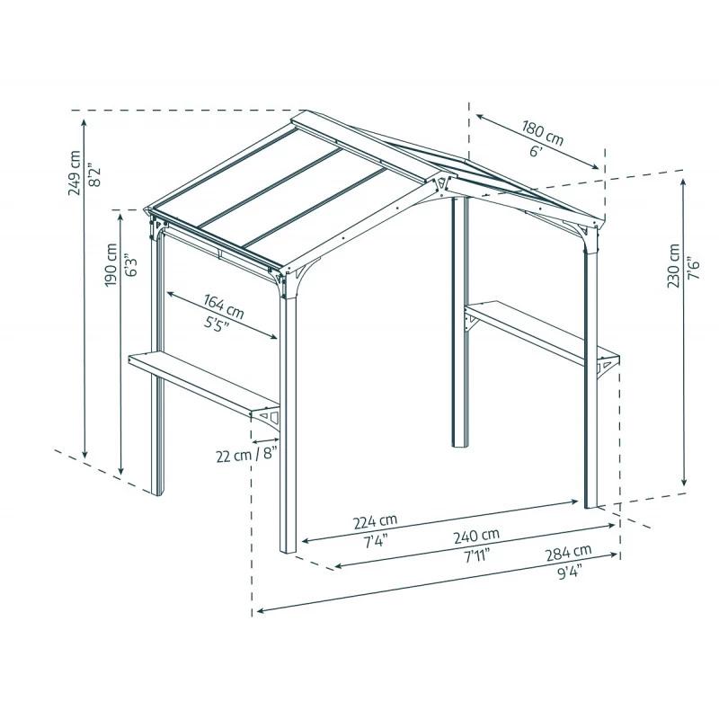 L’abri de jardin AUSTIN bénéficie d’un accès facile grâce à sa largeur de 224cm qui vous permet d’y intégrer un BBQ large de 223cm max. La hauteur sous faîtage de 249cm est également adaptée à vos déplacements aisés. Les 2 étagères en acier inoxydable argenté s’installent sur les côtés et mettent la touche finale du produit. Profitez de son design élégant et confortable et passez des moments agréables en plein air !