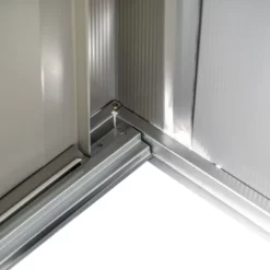 L’abri possède une façade de 194cm qui comprend une double porte coulissante pour un accès aisé et pratique lorsque vos mains sont encombrées ou que vous maniez une brouette. Le passage de porte est de 81cm pour une hauteur de 152cm. Avec une profondeur de 151cm et une hauteur faîtière de 177cm, vous pourrez y ranger confortablement votre outillage de jardin, brouette, tondeuse ou barbecue portable.