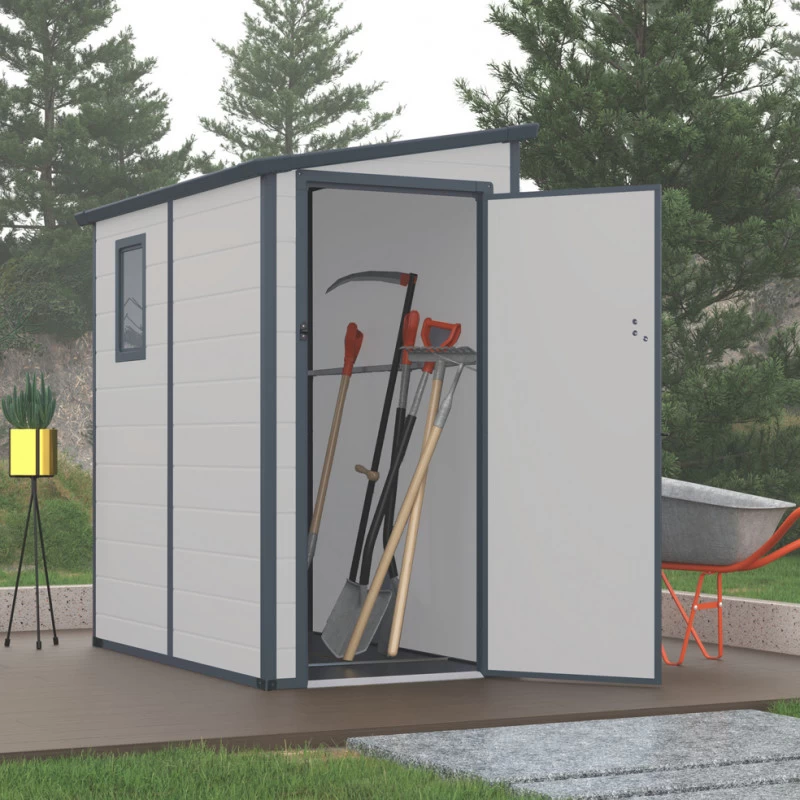 Discret, de couleur moderne, adossé sur le côté de votre maison, vous profiterez d’une surface intérieure de 1,75m² à laquelle vous accéderez par une porte simple battante verrouillable (cadenas non fourni). Une fenêtre fixe apportera la lumière naturelle suffisante pour pouvoir organiser un rangement optimiser dans votre abri. La grille d’aération permet un renouvellement de l’air même quand vous n’accédez pas à l’intérieur de votre abri de jardin pendant plusieurs jours consécutifs.