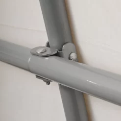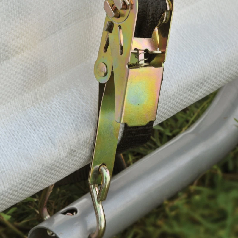 L’accès se fait par une large porte à glissières de 140x150cm qui peut être maintenue ouverte. La paroi arrière est renforcée, et la bâche est solidement fixée à l’armature au moyen de 8 sangles d’arrimage avec tendeurs à cliquet. L’ancrage au sol est assuré par 4 piquets de 38cm de long.