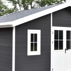 Avec ce modèle en particulier, vous faites le choix d’un abri de jardin traditionnel à la toiture double pente, avec des finitions qualitatives et contemporaines. Celles-ci passent par l’association de la structure robuste en aluminium peint contrastant parfaitement avec les lames en bois composite, mais aussi par l’utilisation d’huisseries qualitatives en aluminium avec double vitrage 5-6-5mm et verre trempé. Les angles droits cassent également les codes des abris de jardin traditionnels emboités mi-bois.