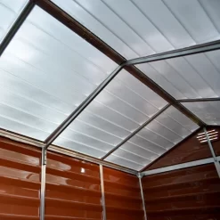 Son coloris ambre se fond harmonieusement dans le paysage, et sa conception robuste est garantie 10 ans. Les panneaux de polycarbonate qui composent les parois et la toiture sont très solides, pratiquement incassables, et ne se décolorent pas dans le temps. Les panneaux de toiture laissent passer 10% de la lumière, ce qui vous fournit un éclairage suffisant pour une utilisation diurne sans apport électrique.
