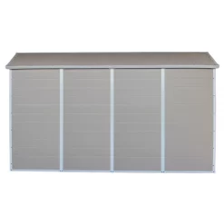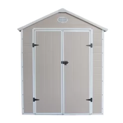 Le coloris beige des panneaux s’intègre harmonieusement dans tout type d’aménagement extérieur, et les bandes blanches des raccords ou entourant la porte offrent un contraste élégant. Située au dessus de la double porte, une grille de ventilation assure un renouvellement de l’air par convection, pour une protection optimale de votre outillage. Sur le côté, une fenêtre fixe en polycarbonate apporte un éclairage naturel pendant la journée, vous dispensant d’amener un éclairage électrique. Cet abri est certifié CE, REACH et RoHS et dispose d’une garantie de 10 ans.