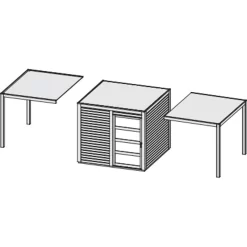 Il dispose d’une porte coulissante au design moderne, avec 4 ouvertures en plexiglas opalin pour un apport naturel de lumière. La porte est munie d’une poignée intégrée avec serrure fermeture quart de tour et 2 clés et le seuil de porte est en aluminium. L’appentis doit être monté sur l’une des parois latérales de l’abri, et offre un espace couvert de 5,6m².