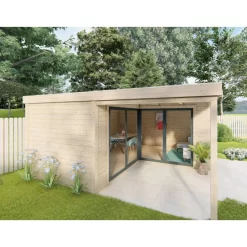 Le bureau de travail 18,6m² Gardy Shelter peut intégrer un plancher (en option) pour l’isoler de l’humidité du sol. Il est constitué de lambourdes et de lames de 20mm d’épaisseur. Son solide toit est également en voliges de 20mm. Les planches de rives sont disponibles sur la façade et les côtés pour une finition soignée.