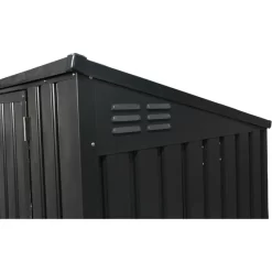 Cet abri métallique est prévu pour accueillir deux poubelles de 240L. Réalisé en tôle galvanisée d’une épaisseur de 0,3mm très durable, robuste et résistant aux intempéries. Le revêtement de qualité ne craint pas les rayures, en couleur de gris anthracite. Conçu pour une utilisation en extérieur, ce modèle très robuste possède un cadre en acier avec renforts diagonaux en profilés dans les coins.