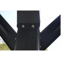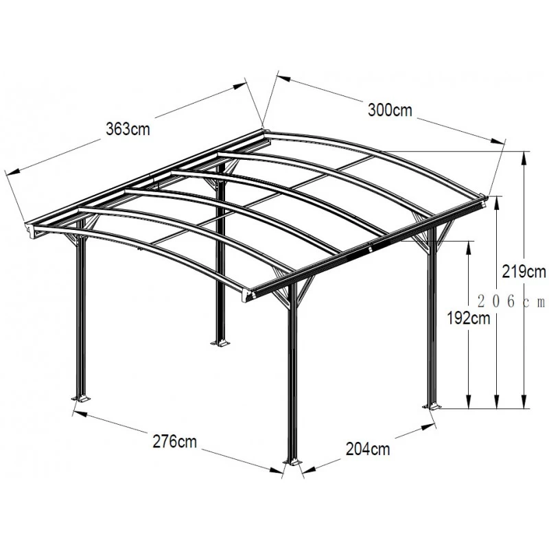 Ses poteaux de sections 10x4cm sont au nombre de 4 et supportent une couverture en polycarbonate alvéolaire de 6mm grise. L’aluminium de 1,2 à 1,5mm d’épaisseur selon les profilés est laqué anthracite pour qu’il s’intègre parfaitement dans votre environnement extérieur.