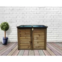 Le coffre est réalisé en pin certifié FSC et traité autoclave au coeur pour les parois et en résine polypropylène assurant une parfaite étanchéité pour le toit.
