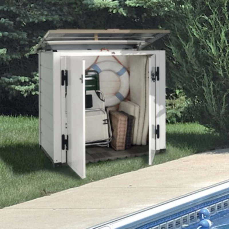 Idéal pour le rangement de conteneurs à déchets, pour des vélos, pour les outils de jardinage ou pour y dissimuler le matériel de filtrage de la piscine. Les cloisons épaisses de 22mm en PVC alvéolaire atténuent le bruit, et isolent des intempéries. Elles sont traitées anti-UV, ne craignent ni moisissure, ni insectes, et gardent un bel aspect durablement. L’entretien du coffre de jardin Garofalo consiste à un lavage avec une solution détergente légère, suivi d’un rinçage à l’eau froide.