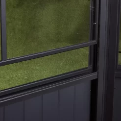 Le pavillon Charleston adossé sera un complément exceptionnel pour l’aménagement de votre terrasse. Avec une largeur de 298,5cm pour une longueur 502cm, sa hauteur faîtière de 244,5cm développe un volume confortable et ample, propice à l’installation d’un salon de jardin ou d’un jacuzzi. Il possède une structure robuste en aluminium gris thermolaqué qui ne craint pas la corrosion et qui peut soutenir une charge de neige exceptionnelle de 150kg/m². Le pavillon est composé de 11 panneaux, dont 9 fenêtres à guillotine et 2 portes coulissantes de 102cm de passage pour une hauteur de 201cm. Montage des portes possible sur le côté droit, gauche et/ou avant.
