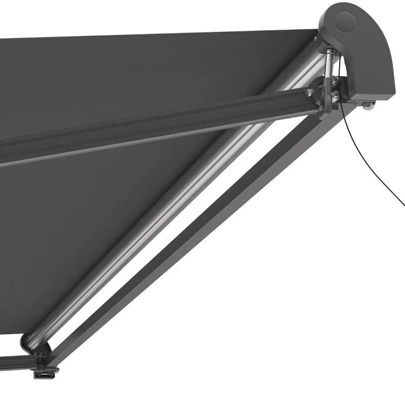 Esthétique, la toile grise anthracite unie en polyester 280gr/m² enduite PU s’accorde parfaitement bien avec sa structure métallique anthracite. L’ensemble, aux tons contemporains, reste très discret.