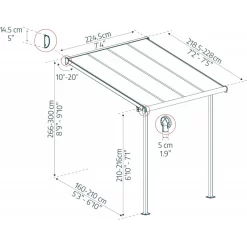 Le cadre en aluminium inoxydable gris anthracite est peint par poudrage et résiste à la rouille. Les pieds sont ajustables latéralement par rapport aux extrémités et les hauteurs à l’avant et à l’arrière sont également modulables. La barre d’accroche faîtière peut être installée à une hauteur variant de 266 à 300cm et la partie avant à une hauteur variant de 210 à 216cm. Les différents réglages modifient l’inclinaison de la pente de la toiture dont la valeur peut être comprise entre 10 et 20° en fonction de l’enneigement et de la configuration de votre terrasse.