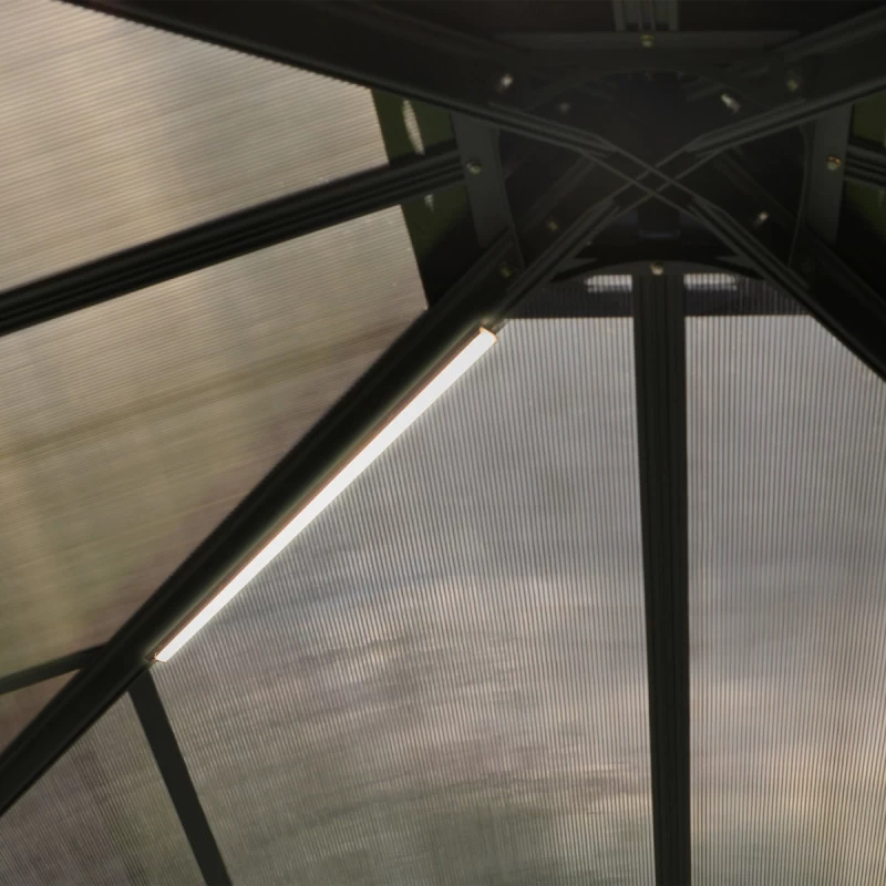 Pour une utilisation prolongée, cette tonnelle de Canopia by Palram est livrée avec un éclairage LED d’un rendement de 2000 Lumen avec une température lumineuse blanche de 4000K. Cette bande LED de 67cm s’installe facilement, elle est livrée avec un profil de montage, un panneau diffuseur de lumière, un transformateur et 120cm de câbles. Le câblage s’intègre en toute discrétion dans les profilés en aluminium de la structure, et doit se raccorder à l’installation électrique (prise non incluse). Ce produit exclusif très solide bénéficie d’une garantie dégressive de 10 ans.